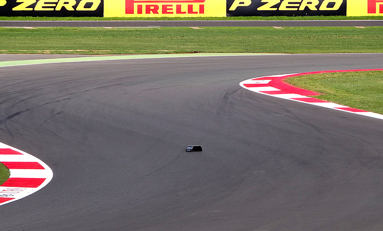 I was in the “Club A” stand which gave us a direct view of the final tussle between Hamiton and Massa for 4th place at Club Corner. Everyone in the surrounding 3 or 4 stands were on their feet as Hamilton managed to fight his way back to keep 4th place. Hence the following seemingly silly photo of a bit of his car left on the track after the contact between them.