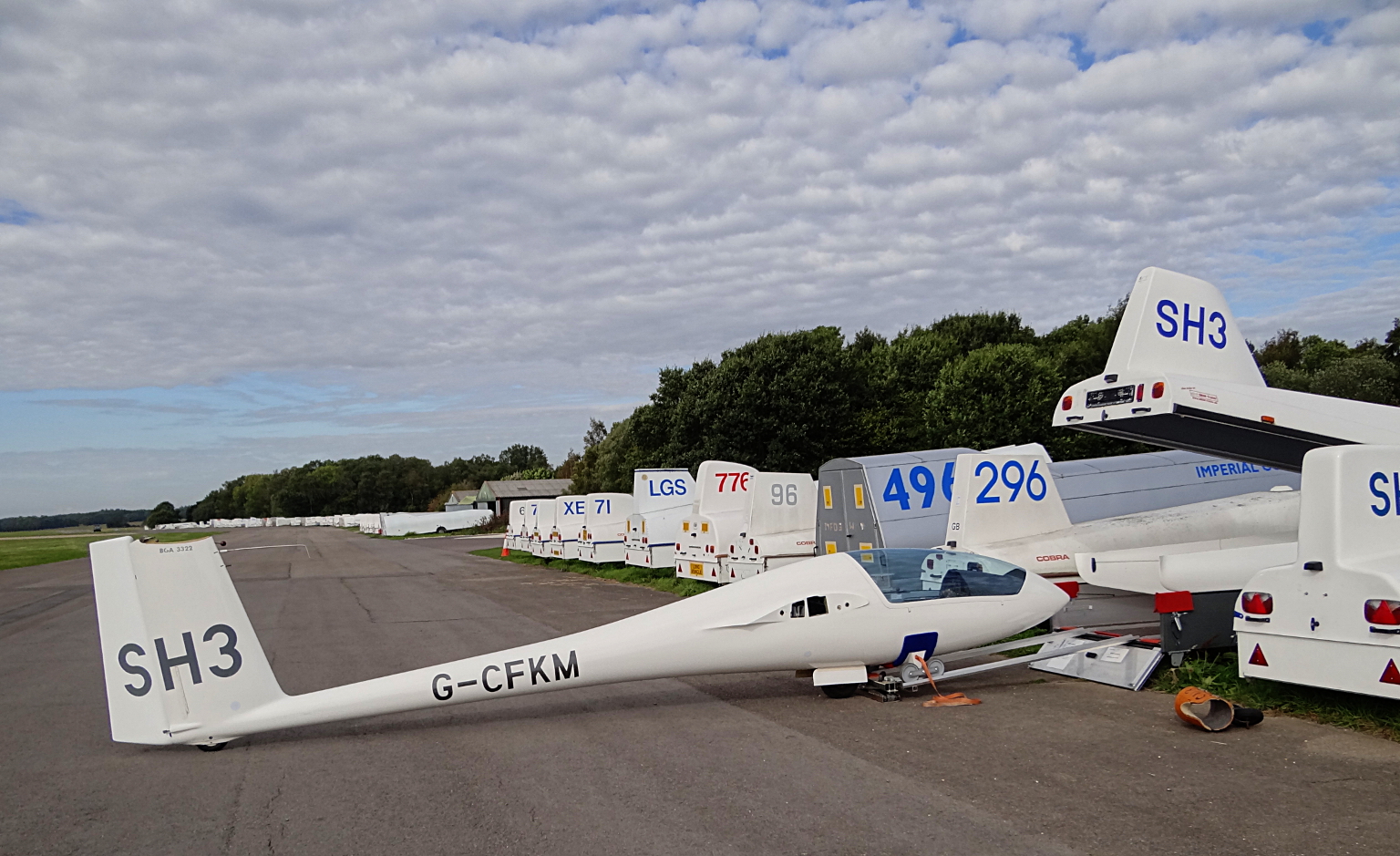 When deciding which single seater to fly, I had made another “lazy” decision to take SH7, the baby Grob, since I knew it would be rigged. As it turned out it was buried at the back of the hangar so I decided to rig one of the “Modern Beauties“, Discus SH3 as I expected this would be less of a chore to get ready for flying. There were 6 other gliders in front of SH7 in the hangar and a definite dearth of helpers.