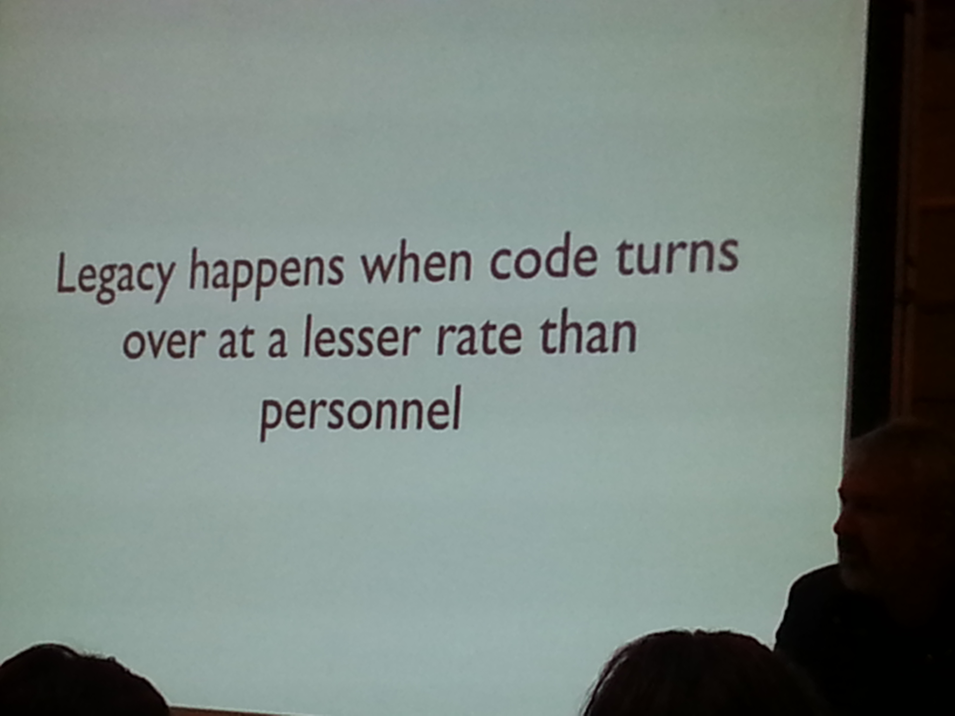 • Interesting research from Robert Smallshire in the audience: Developer halflife is 3.5 years. Code halflife is 35 years. (See this presentation)